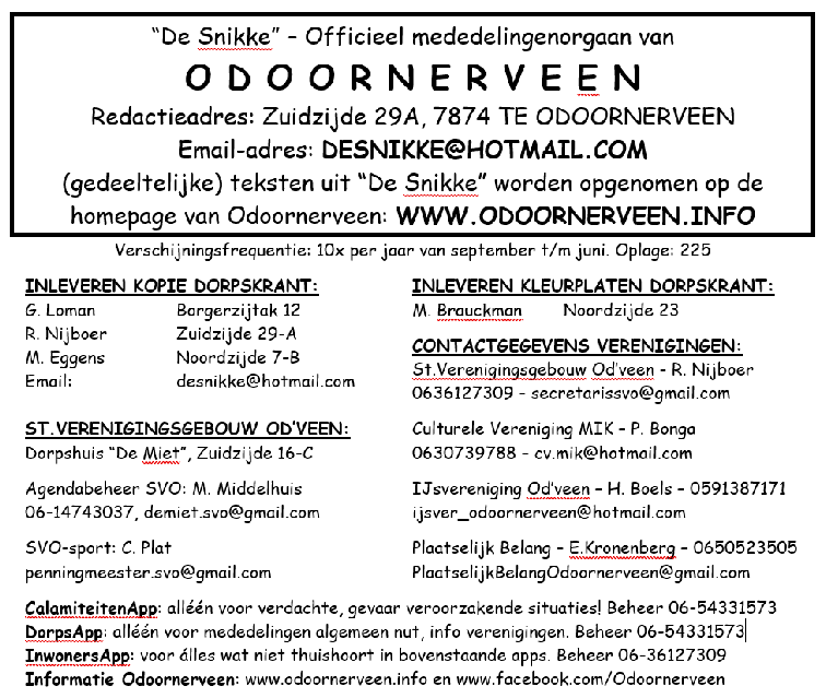 Aan deze krant doen in eerste instantie 6 verenigingen mee, te weten OVO, MIK, Plaatselijk Belang, Plattelandsvrouwen, IJsvereniging en de o.l.s. Oranje. Deze verenigingen kunnen 5 keer per jaar copy inleveren en net zo vaak zal er ook een krant verschijnen. Ook u als lid van die vereniging kunt natuurlijk copy inleveren. Zodoende willen we graag d.m.v. 'De Snikke' de saamhorigheid in Odoornerveen in stand houden, maar tevens nog proberen deze te verbeteren. Er kan natuurlijk wel eens een typefout of een onduidelijkheid in staan, maar we hopen dat u ons dit niet kwalijk zult nemen.